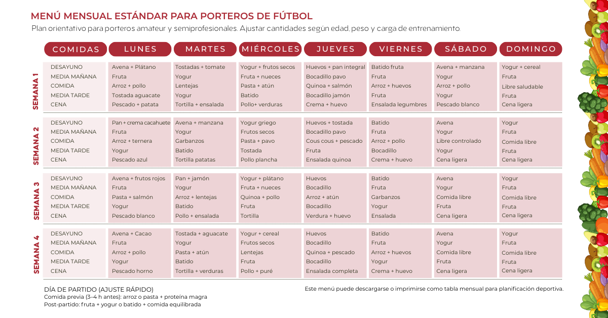 La realidad de muchos porteros es clara: poco tiempo, entrenos por la tarde y comidas sencillas. Por eso, es mejor apostar por opciones fáciles de preparar y repetir:
